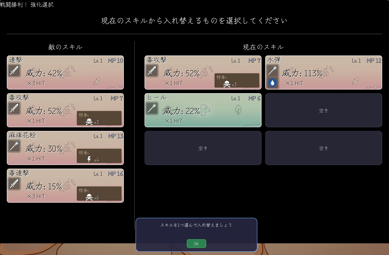 最初は弱いスライムですが、倒した相手のスキルや特性を吸収して強くなれます。 相手選びとビルド(構成)の組み合わせが攻略の鍵になる、手軽に遊べるゲームです!